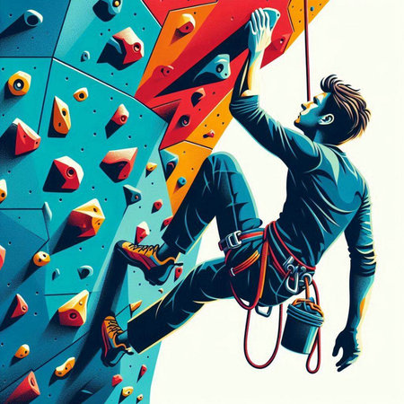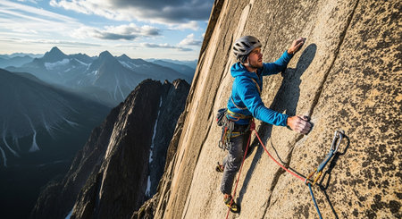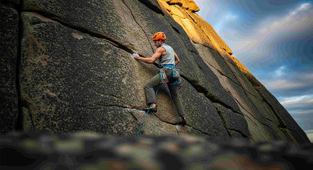 Scaling a steep rock wall with a vibrant sky in the background, a climber exudes strength and adventure in a dramatic scene