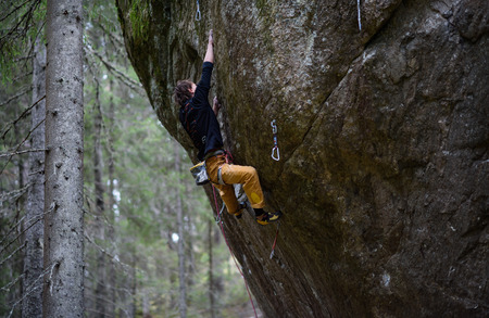 Athletic man climbs a rock in the forest with rope. Sport climbing in Crimea, lead.