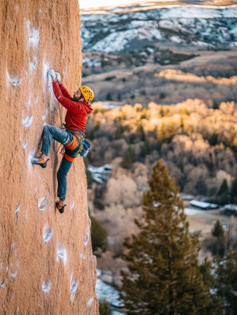 A climber skillfully scales a rugged rock face as the sun sets in the background, illuminating the mountainous terrain. The athlete is equipped with climbing gear, showcasing determination and focus. The warm light enhances the beauty of the outdoor adventure.