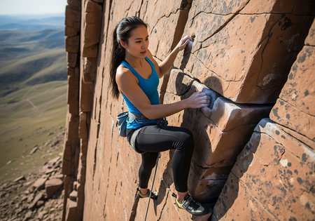 A woman in athletic attire is seen climbing a steep rock face. She is equipped with climbing gear, including a harness and ropes, and is focused on her ascent. The background reveals a scenic landscape with rolling hills and clear skies, indicating an outdoor adventure setting.