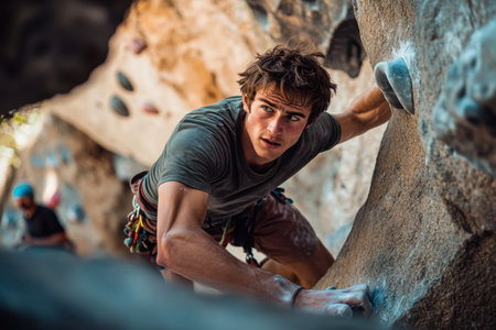 Young climber is scaling a difficult rock face, using his strength and determination to reach the top