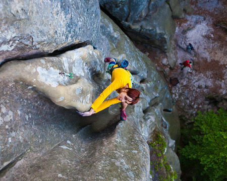 beautiful girl climbs the rock. sport climbing in nature. extreme sport. fitness and beauty