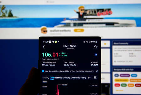 Montreal, Canada - February 3, 2021: GME GameStop ticker and price over wallstreetbets webpage. Gamestop GameStop Corp. is an American video game, consumer electronics, and gaming merchandise retailer