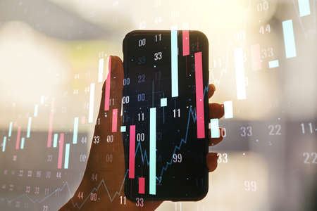 Double exposure of abstract creative financial chart and hand with cell phone on background, research and strategy concept