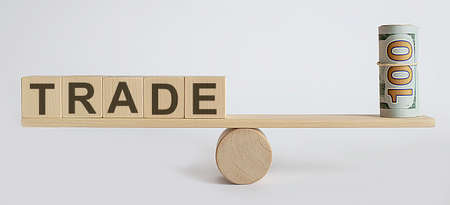 Euro and dollar parity concept. Dollar and euro symbol on wooden blocks on a seesaw. Copy space