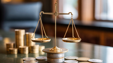 Balanced scales and stacks of coins evoke concepts of financial equilibrium and wealth distribution.