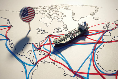 A miniature oil tanker moves across a stylized world map connected by red and blue pipelines while a united states flag marker stands over north america symbolizing energy export and trade logistics.