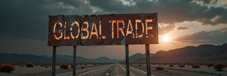 That the image is generated using AI. Abandoned road with weathered global trade sign at sunset in desert landscape.