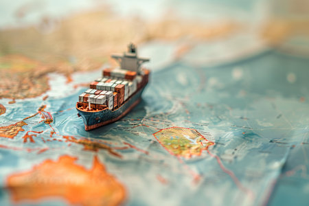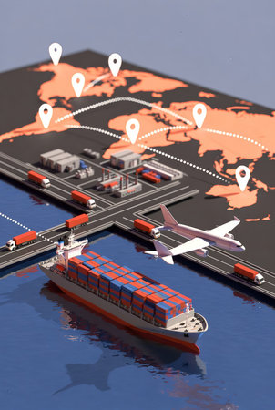 A captivating visualization of global trade, featuring a world map adorned with shipping containers and cargo ships, highlighting the connectivity of international logistics.
