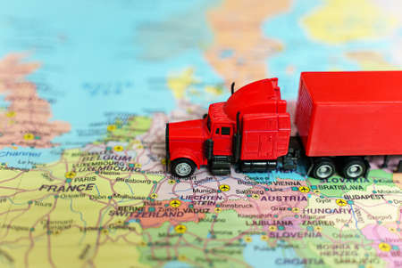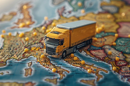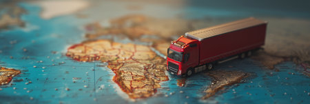 Truck model transporting goods across international borders, set against a world map, with a focus on the concept of cross border transportation and trade.
