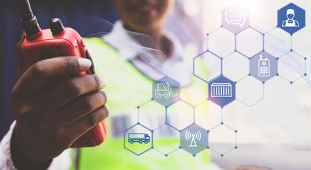 closeup worker using ham radio for operation control in cargo port shipping