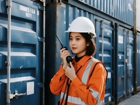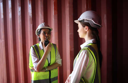 Asian female worker wearing safety helmet and reflective vest using walkie talkie at container yard. Concept of logistics, shipping, transportation, occupational safety asian, teamwork, and industry.