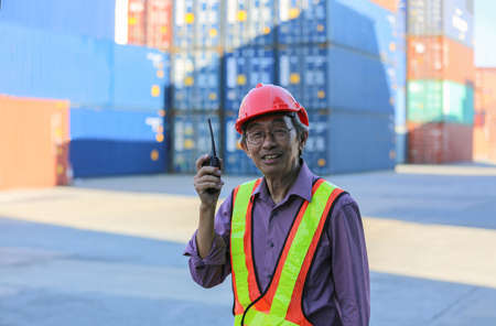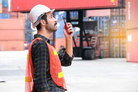 Side views of Engineer worker or technical standing in the container yard shipping area and used radio communication to control loading containers into the stack. Industrial and import-export concept
