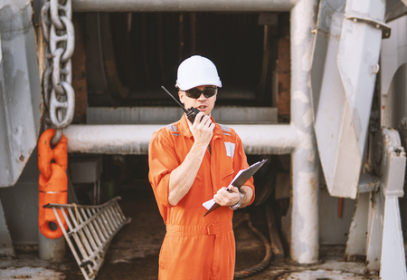 Marine Deck Officer or Chief mate on deck of offshore vessel or ship , wearing PPE personal protective equipment - helmet, coverall. He holds VHF walkie-talkie radio in hands.