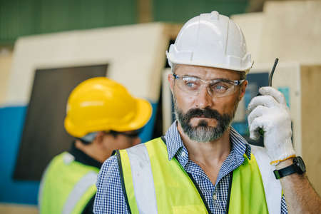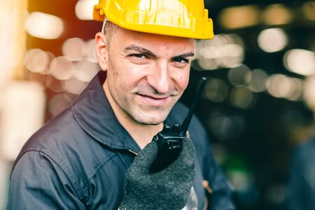 Portrait of labor worker engineer hand holding radio for talking communication with coworker in industrial factory and waring safty suit.