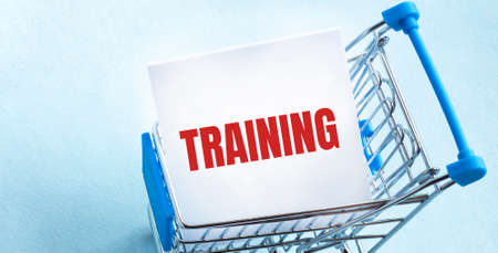 Hand pushing miniature toy supermarket trolley. White background. training TEXT Shopping concept.