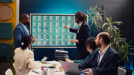Team of business analysts following stock trade trends on interactive board, developing a new financial strategy to obtain funds. Forecast affiliates working on organizational success. Camera B.
