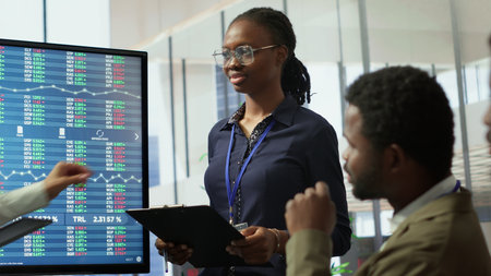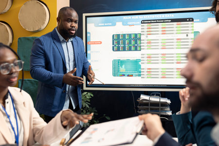 Team leader and his staff conducting a market research for progress, understanding the financial situation. Business associates working on infrastructure investments to fulfill company objectives.