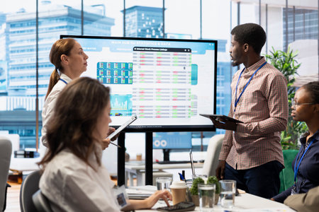 Chairman of the board reviews potential enterprise expansion, team supervisor and the members look into data visualizations. Forecast affiliates seek to boost organizational earnings.