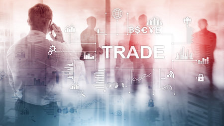 Concept of business and technology. Inscription on virtual screen: TRADE. Currency icons mixed media.
