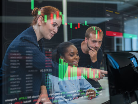 Stock charts on a virtual screen. Colleagues look at the monitor and decide working moments in the office.