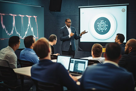 An instructor utilizes digital projection technology to enhance the learning experience for participants taking notes during an engaging corporate training workshop