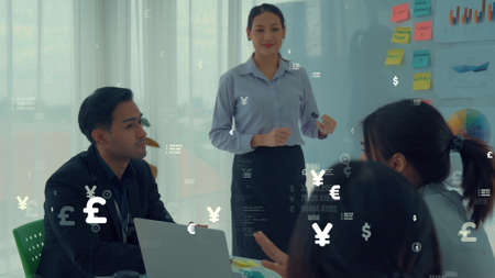 Image of currency and financial data processing over diverse business people in office. Global finance, business, connections, computing and data processing concept digitally generated image.