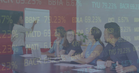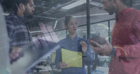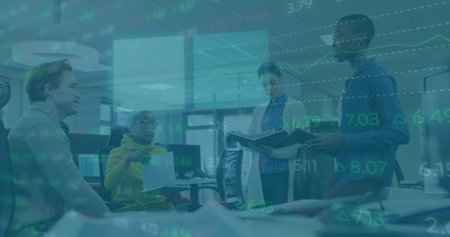Image of stock market data processing over diverse colleagues discussing over document at office. Global economy and business technology concept