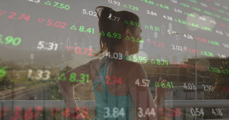 Image of financial data processing over caucasian woman running in city. Global sports, business, finances, computing and data processing concept digitally generated image.
