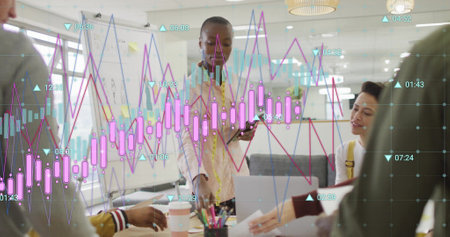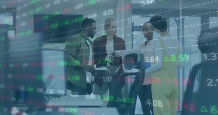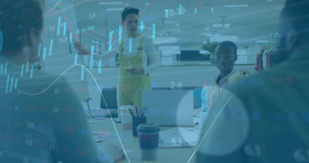Image of financial data over diverse coworkers in office. Business, finance and economy concept digitally generated image.