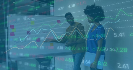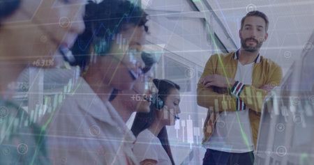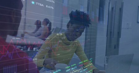 Image of statistics and financial data processing over business people working in office. Global business, finance, computing and data processing concept digitally generated image.