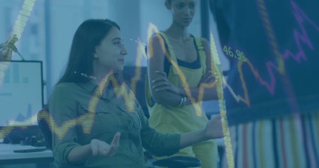 Image of financial data and graphs over diverse female coworkers in office. Business, finance, economy, cooperation and communication concept digitally generated image.