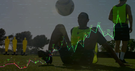 Image of data processing on graph over diverse male group relaxing after cross training at gym. Fitness, exercise, strength, data, digital interface and technology digitally generated image.