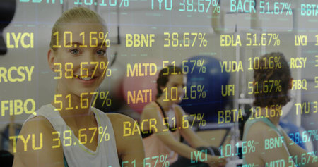 Image of data processing over diverse sports people at gym. Global business, sport and digital interface concept digitally generated image.