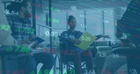 Collaborating wheelchair user sharing finance ideas in office, with yellow folder, stock overlay. Team, innovation, accessibility, diversity, technology, strategy, inspiration