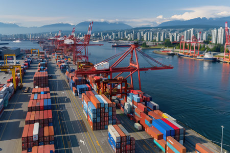 A vibrant aerial shot of a massive cargo ship at port, surrounded by stacks of colorful shipping containers, with majestic mountains and a bright sky in the background.