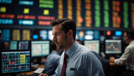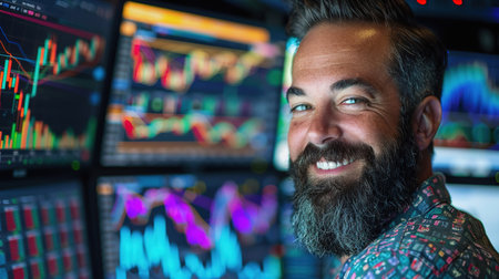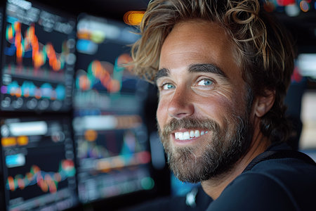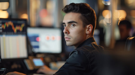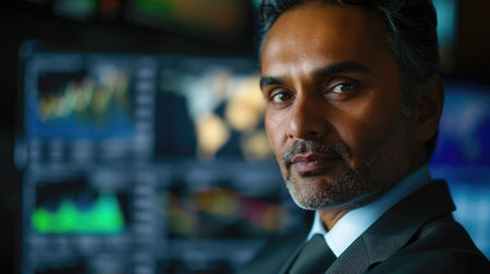 A man in a suit is looking at a computer screen with multiple graphs. The man is focused and attentive, possibly analyzing the data on the screen. Concept of professionalism and concentration