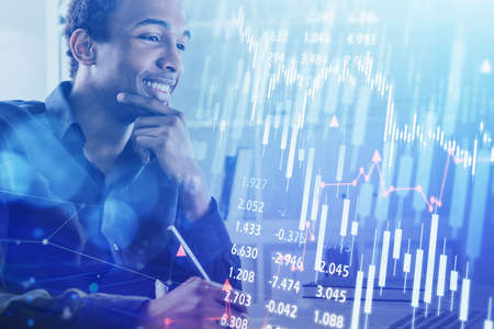 Smiling Afro-American business man or stock trader analyzing stock graph chart by fibonacci indicator, side view businessman using pc to buy or sell stock, double exposure graph, internet trading
