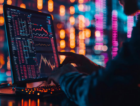 A close-up view displays a computer monitor showcasing financial charts and graphs indicative of market analysis. The screen is illuminated, highlighting data points and trend lines, suggesting investment strategies and economic forecasting. The image's use could be beneficial for articles concerning market trends or business publications.