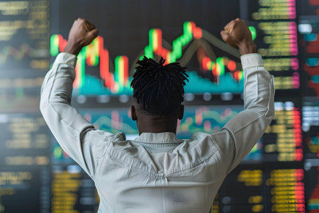 Rear view of a young man holding his smartphone while investing and checking the rise of the stock market