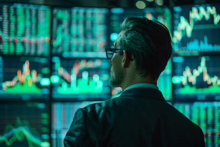 A financial analyst focuses on stock market trends displayed on a dual-monitor setup in a contemporary work environment at night.