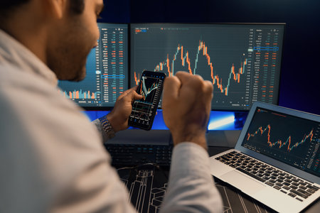 investment stockbroker predicting bitcoin price trend movement using laptop and phone