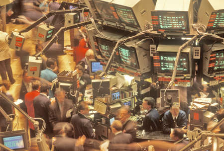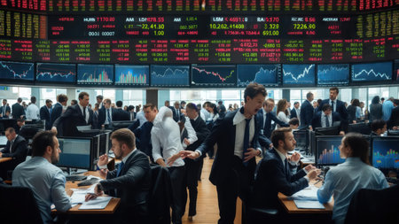 Traders engage in active discussions on the stock exchange floor during a bustling trading session