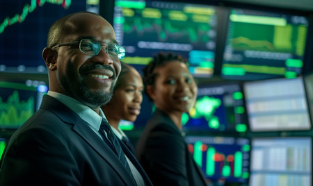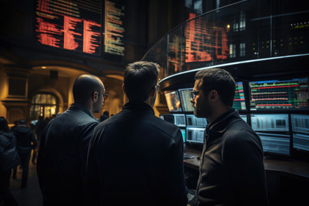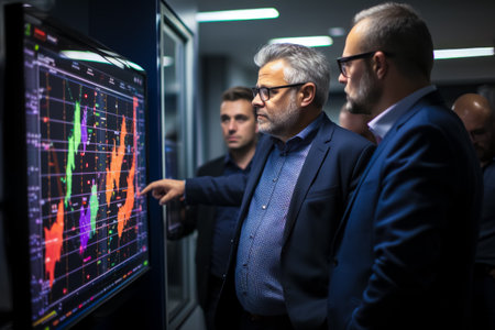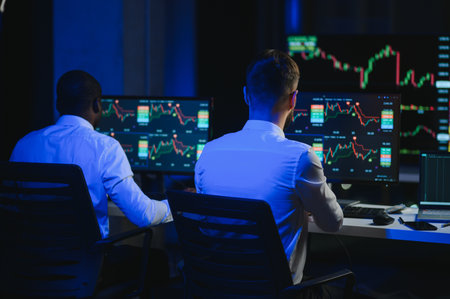 Group of investors observing stock market data in a trading room during trading hours at a financial institution