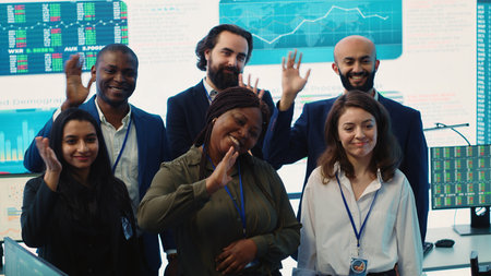 Confident smiling enterprise team uniting their forces to improve workflow and efficiency, achieve organizational goals. Diverse group of analysts work in telecommunications control room. Camera A.