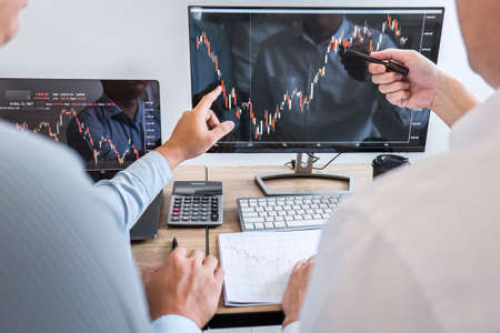 Business team partner working with computer, laptop, discussion and analyzing graph stock market trading with stock chart data planning, financial and investment concept.