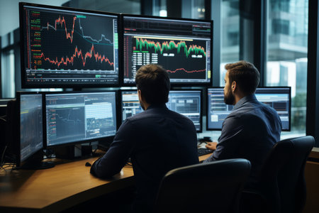 Financial brokers monitoring stock market, analyzing price flow and buying stocks