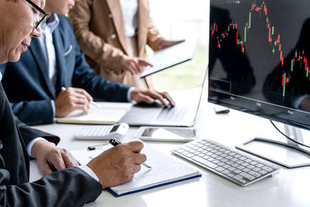 Business team on meeting to planning investment trading project and strategy of deal on a stock exchange with partner, financial and accounting concept, collaborative teamwork analyze data.