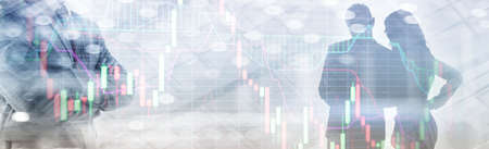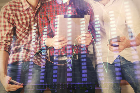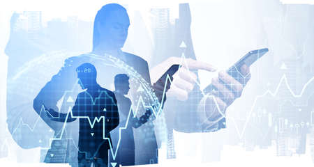 Double exposure of forex graph drawing and man and woman working together holding and using a mobile device. Trade concept.