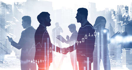 Businessmen shaking hands while working together on abstract city background with forex chart. Teamwork, trade, finance and technology concept. double exposure